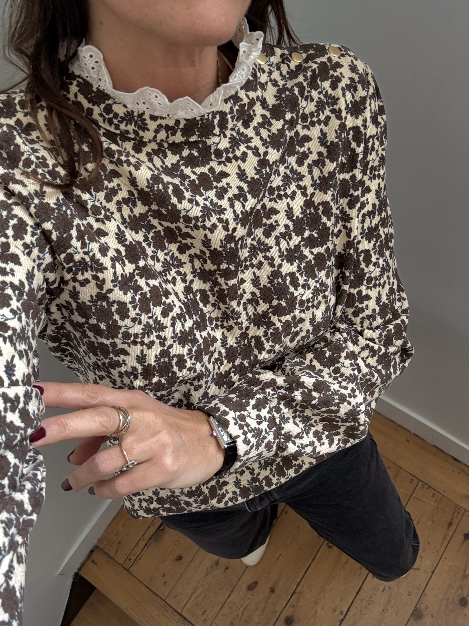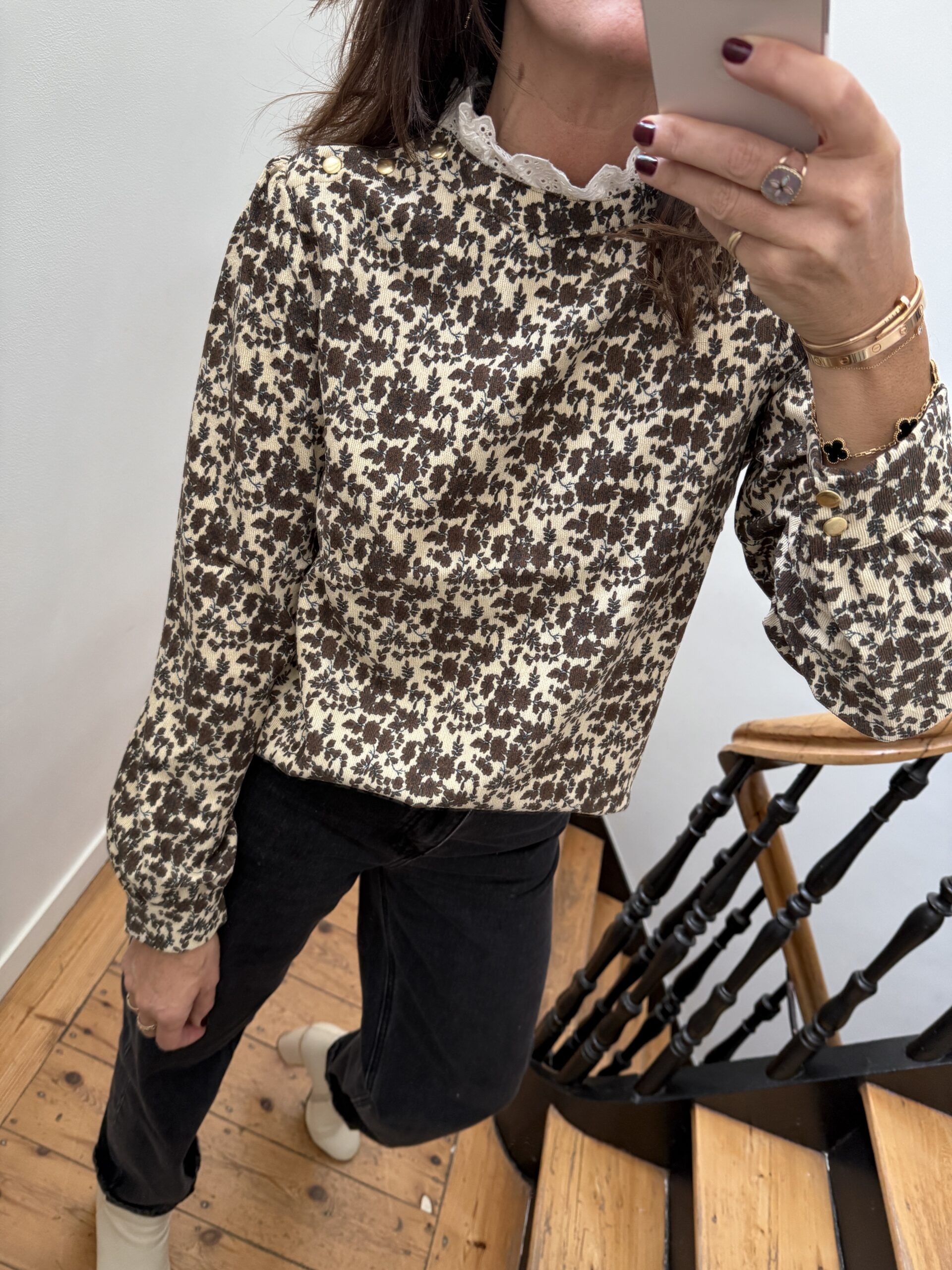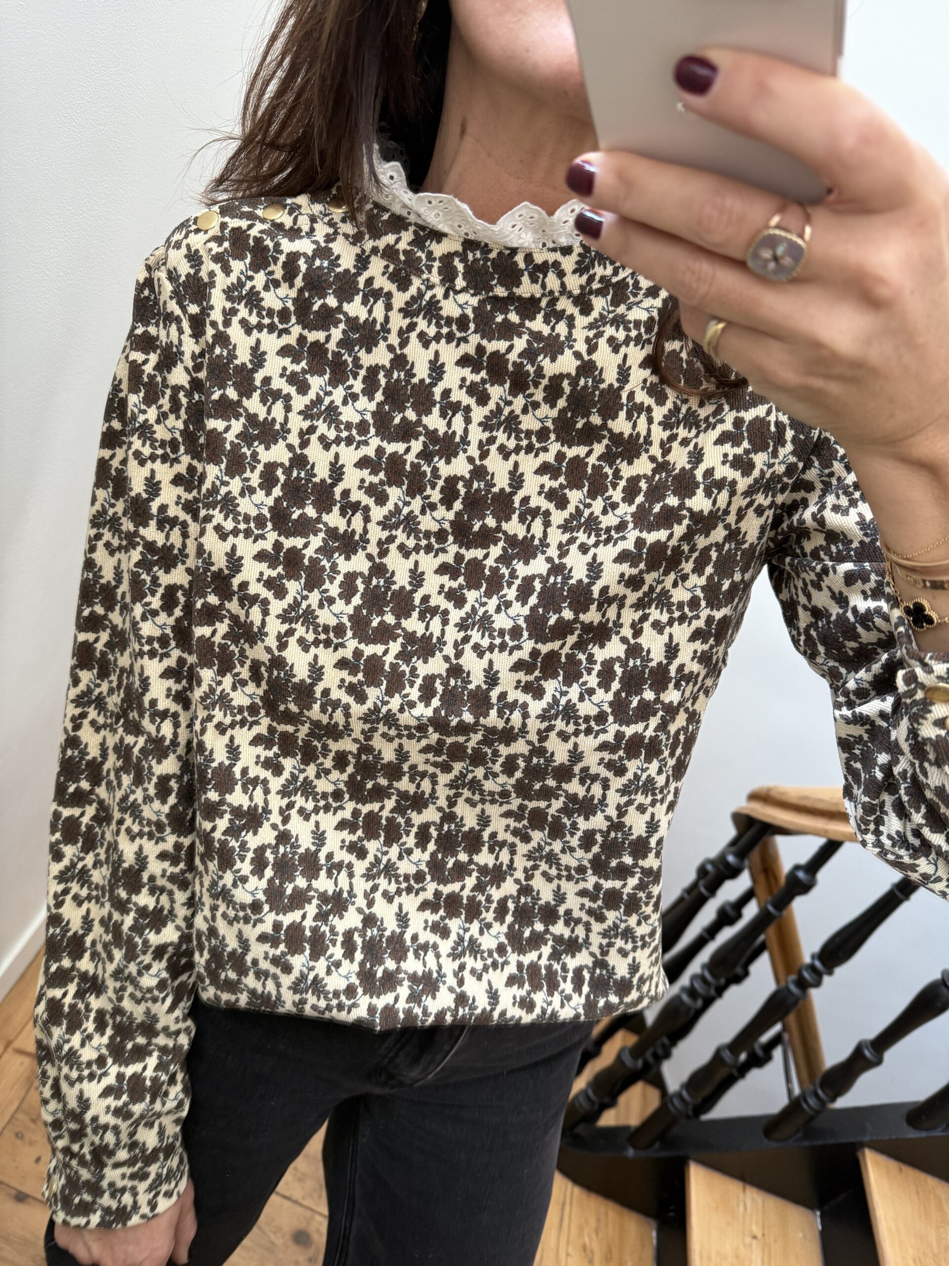 Blouse fleurie velours fin milleraies col broderies anglaises