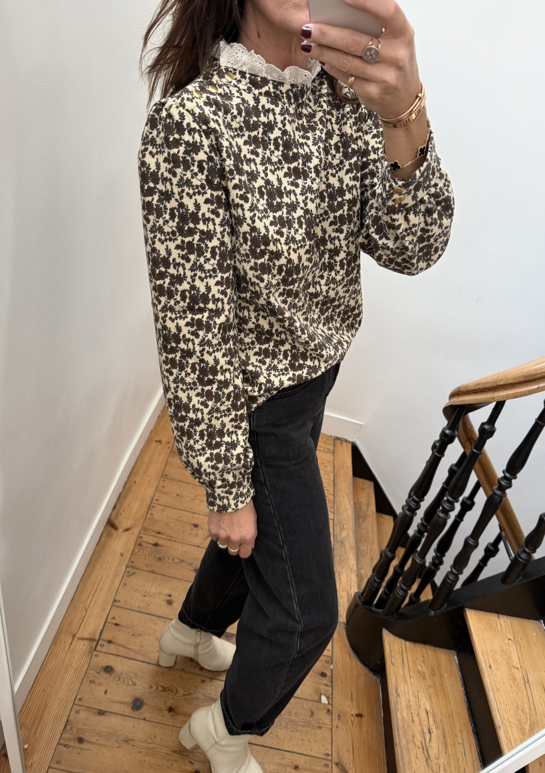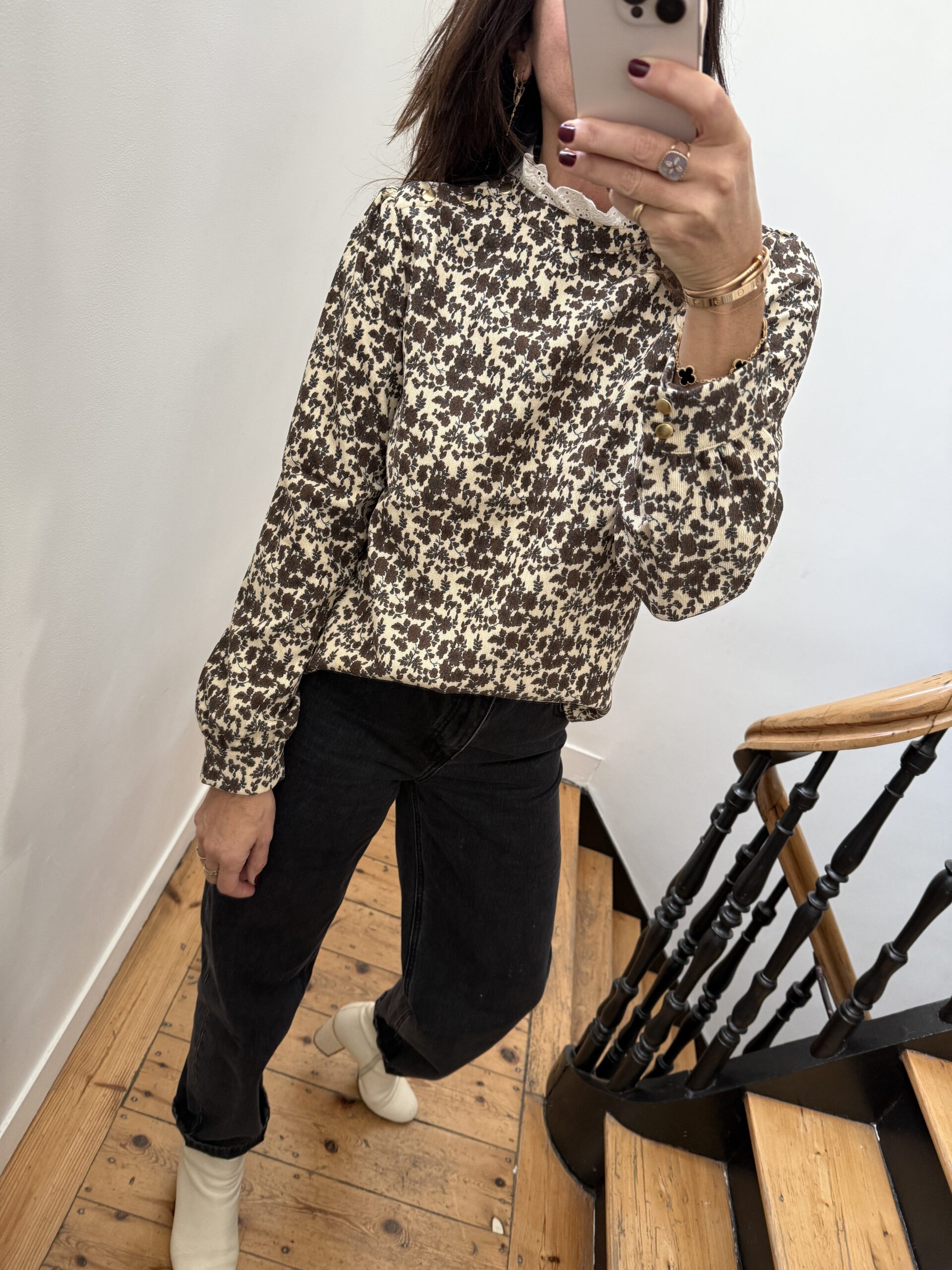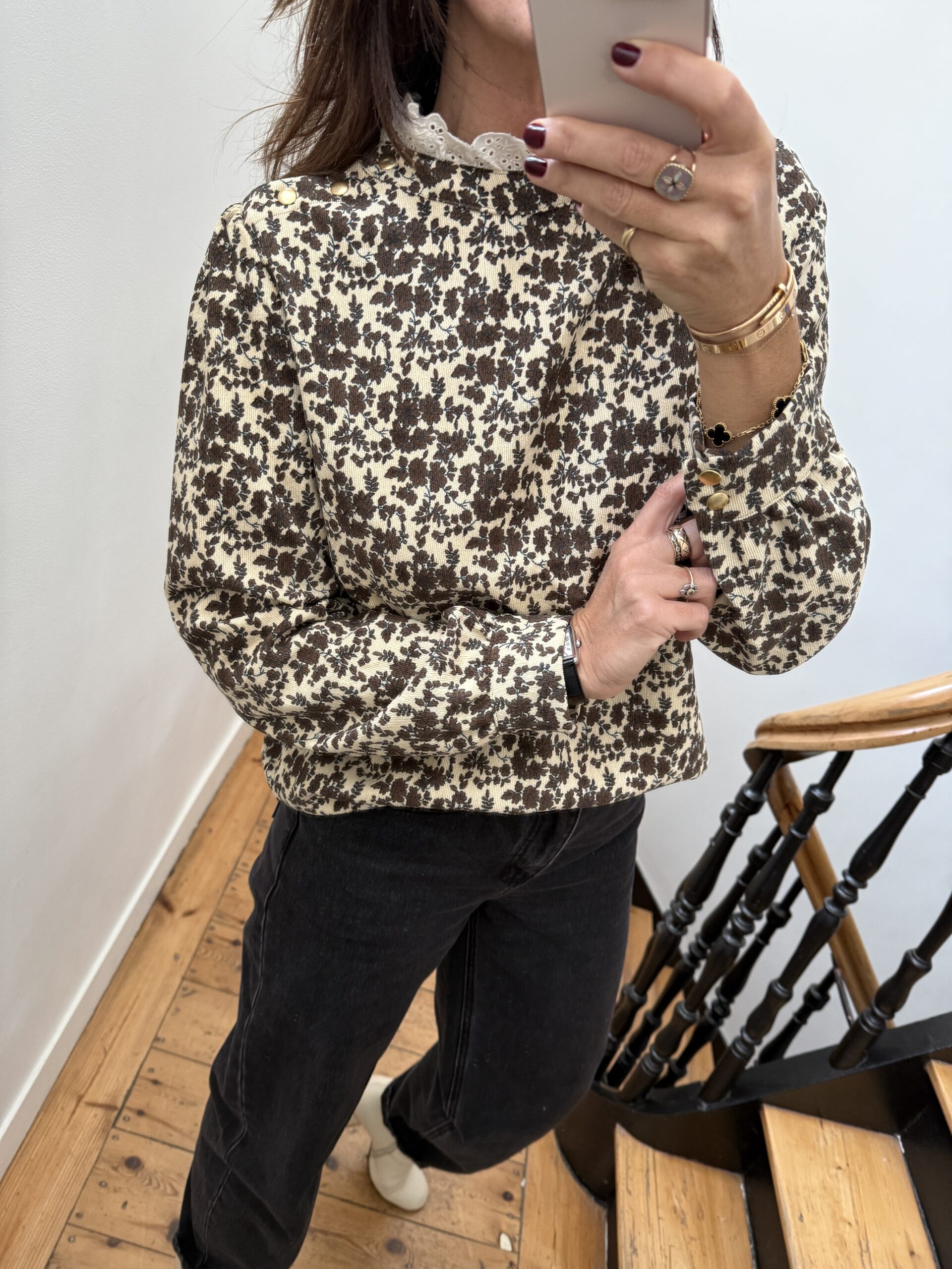 Blouse fleurie velours fin milleraies col broderies anglaises