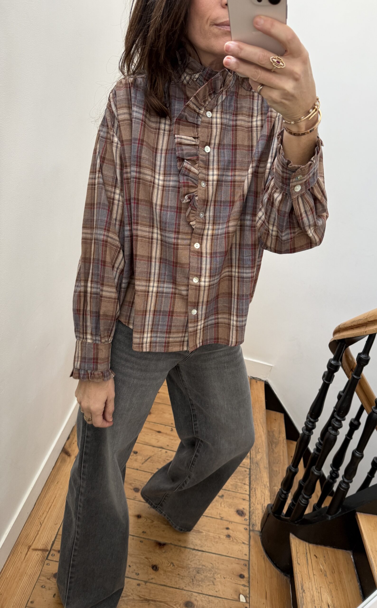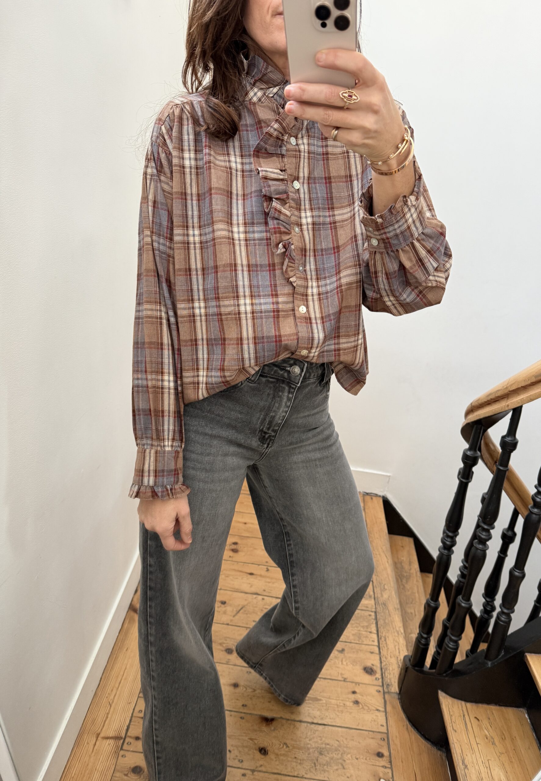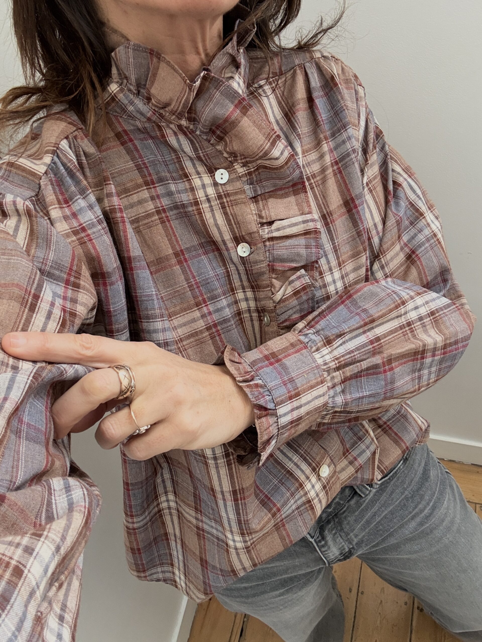 Chemise col frou frou volant tartan marron