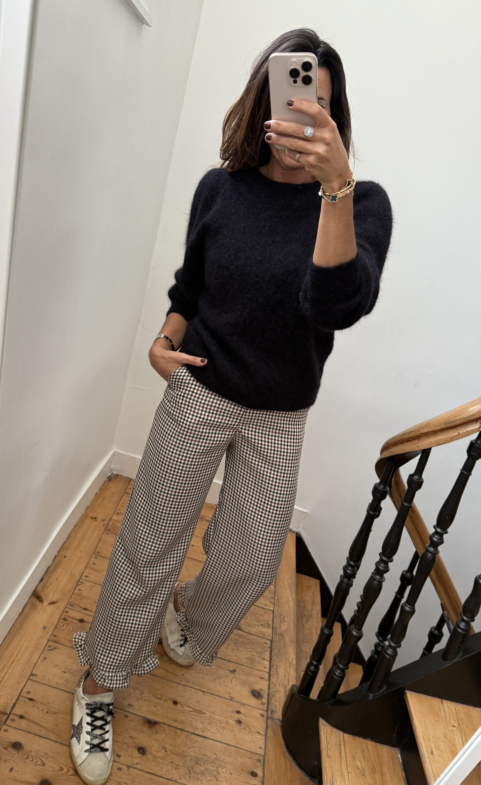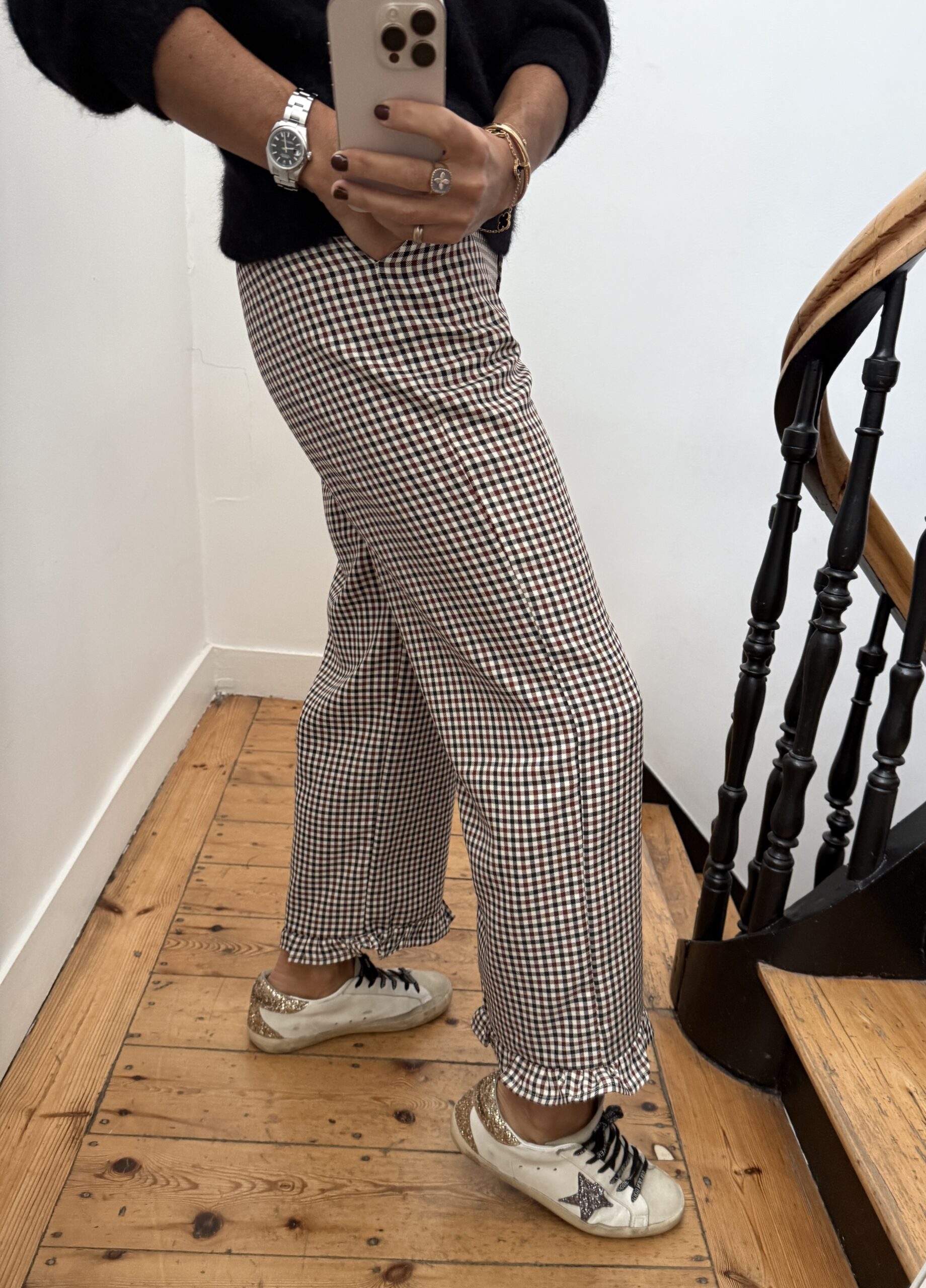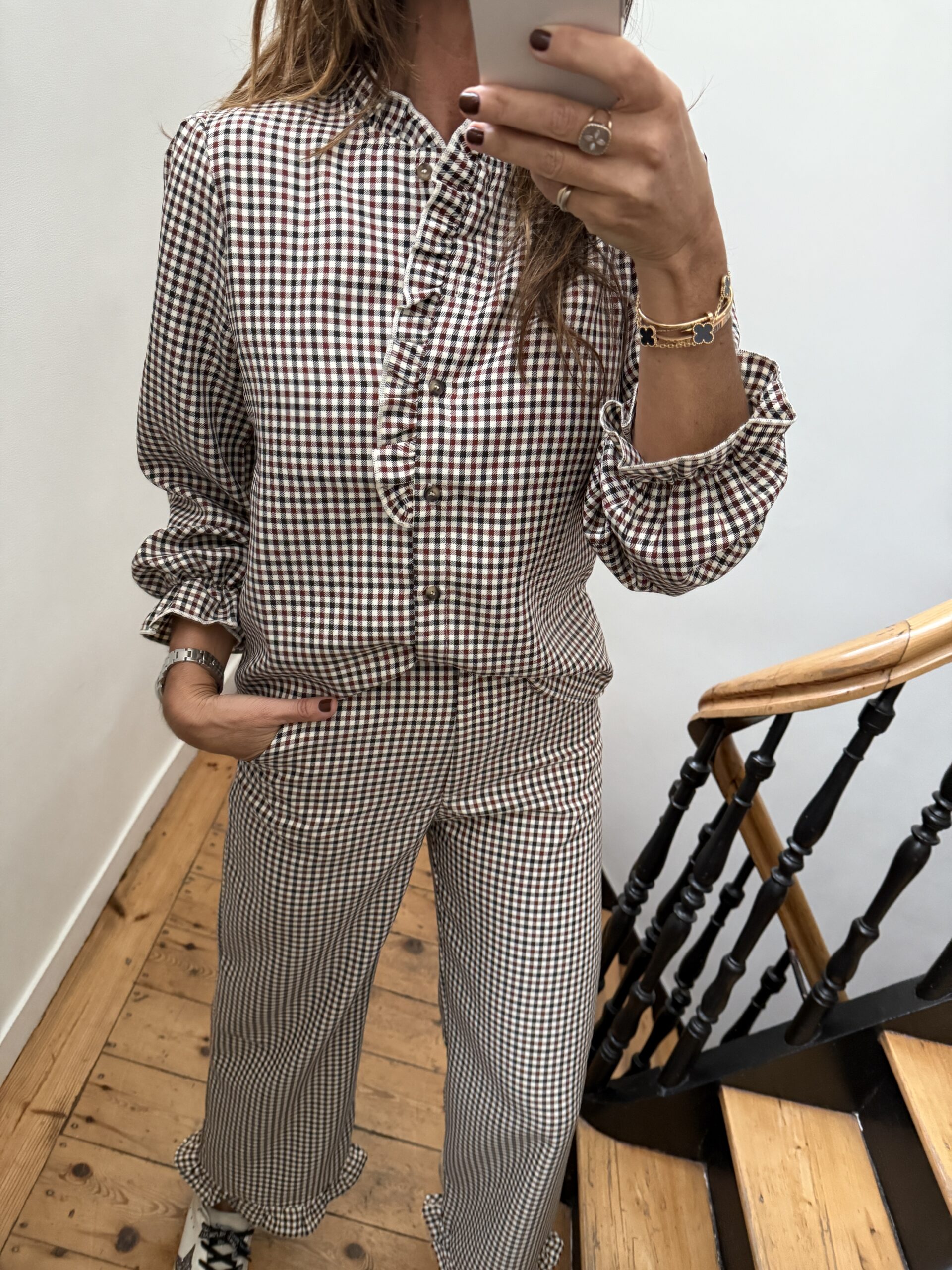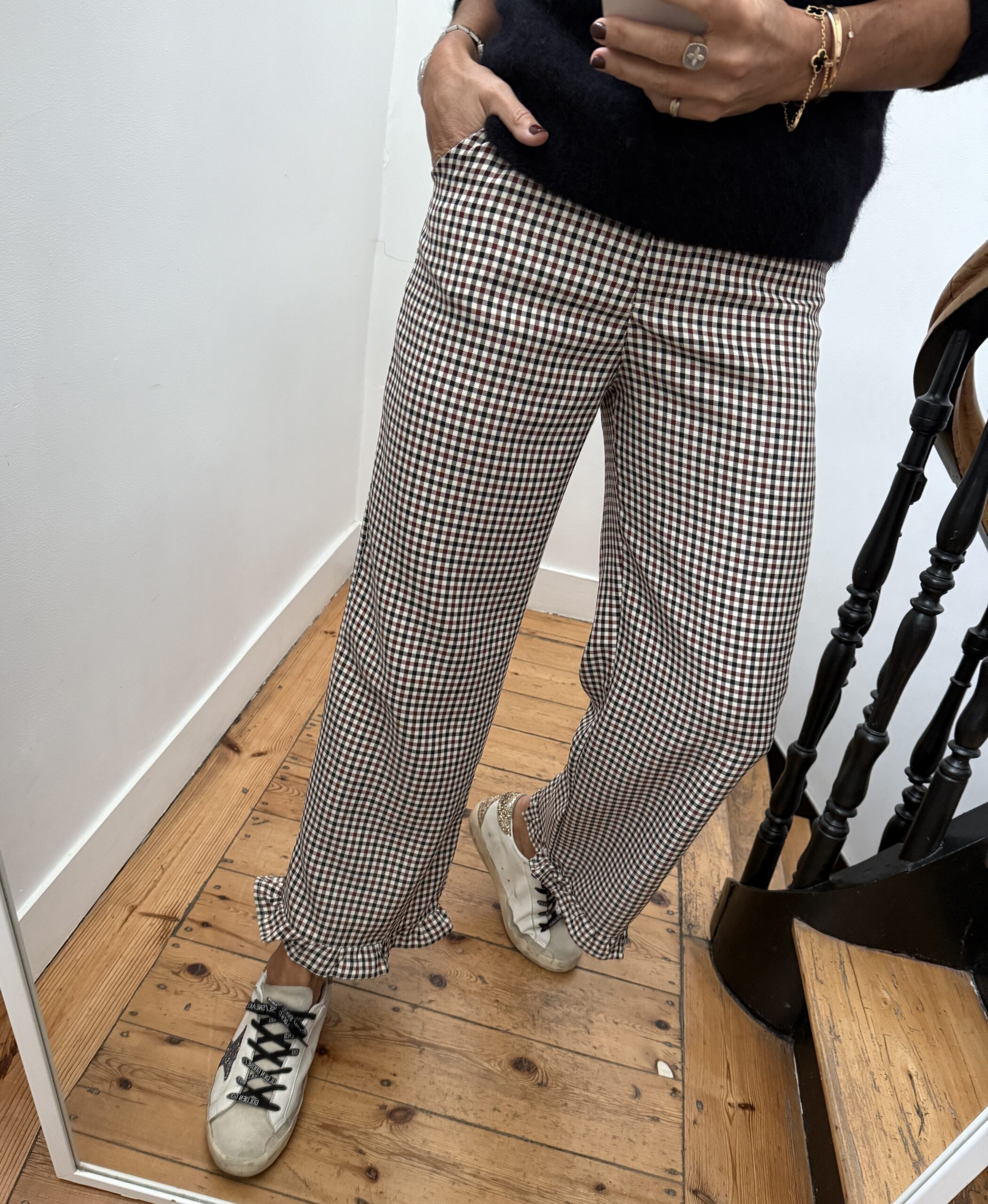 Pantalon bas frou frou volant mini carreaux noir bordeaux